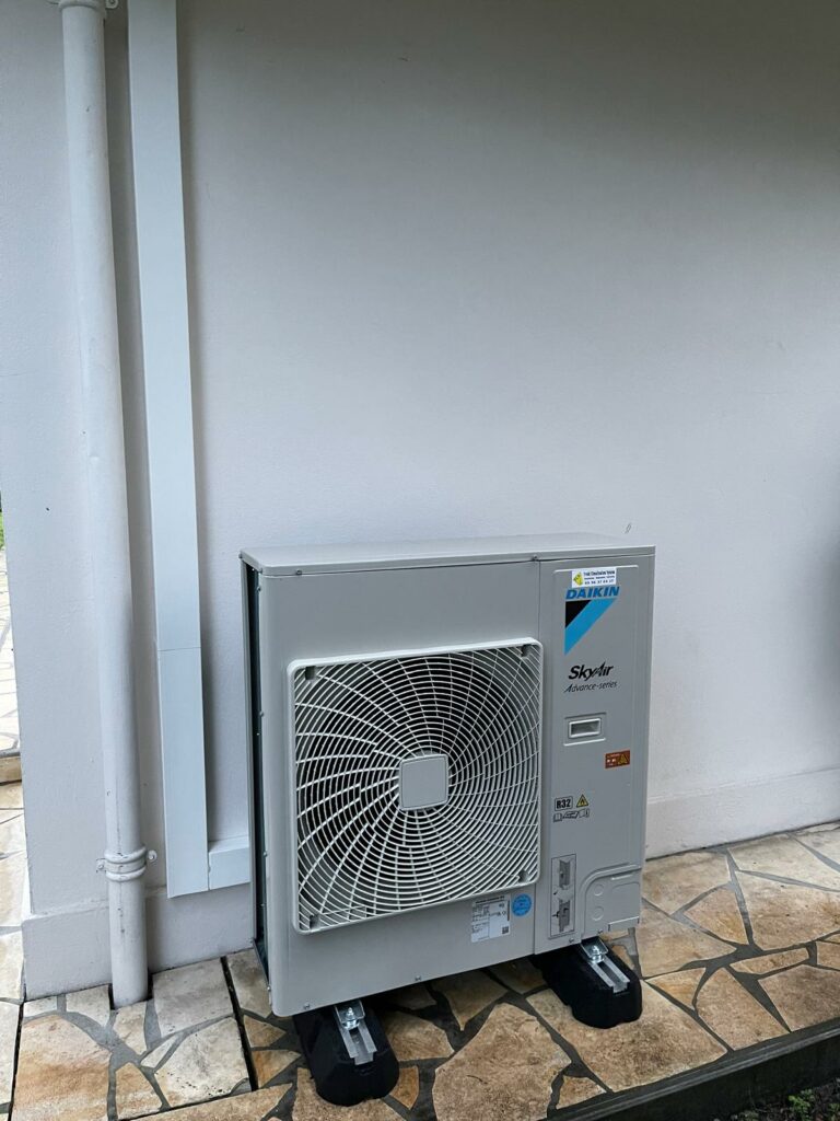 Cette installation assure un chauffage l’hiver et une climatisation l’été, tout en respectant les meilleures normes d’efficacité énergétique.